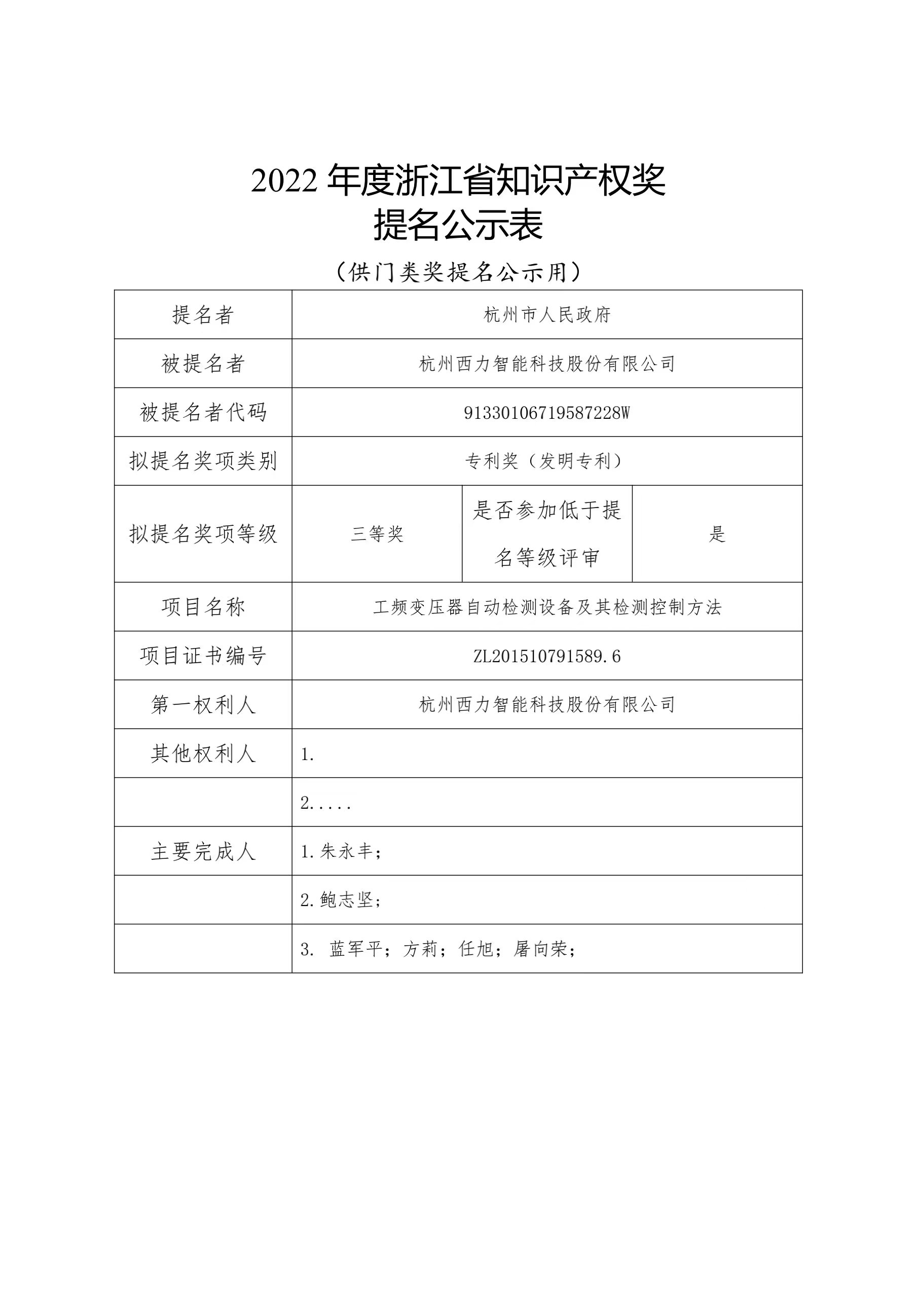 2022 年度浙江省知識(shí)產(chǎn)權(quán)獎(jiǎng)提名公示表